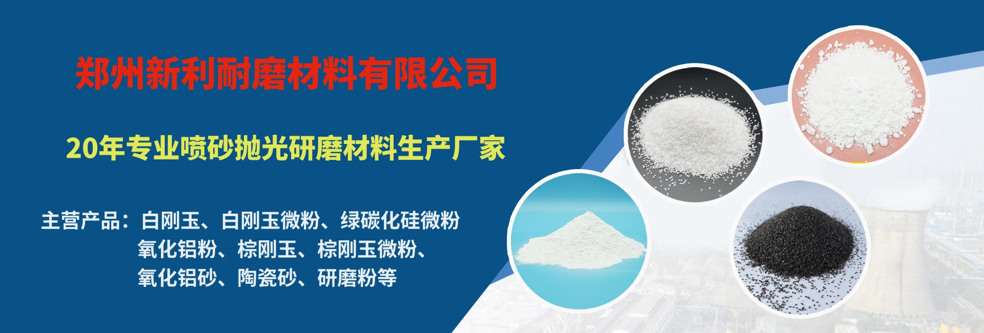 鄭州新利耐磨材料有限公司主要產品:包含白剛玉砂、白剛玉微粉、棕剛玉、棕剛玉微粉、 綠碳化硅微粉、氧化鋁砂、氧化鋁粉、研磨粉等多系列產品,為客戶提供豐富的產品型號及加工定制服務...